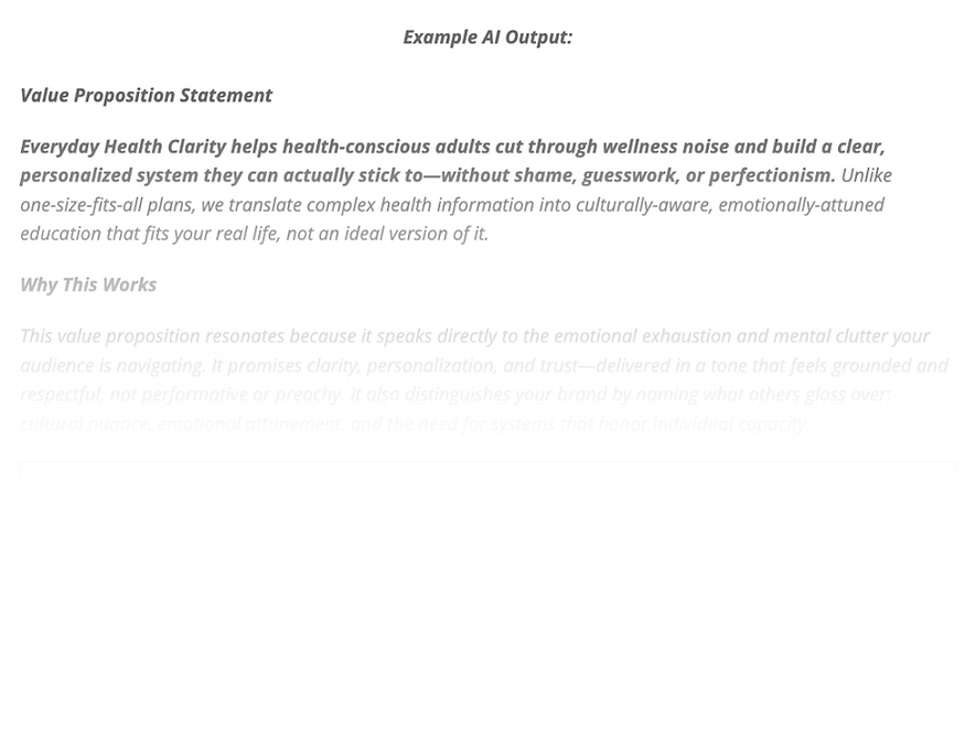 Implementation Application Guide with specific guidance on how to apply your messaging frameworks across different channels and contexts, from LinkedIn posts to sales conversations. You'll know how to exactly adapt your voice for each situation.